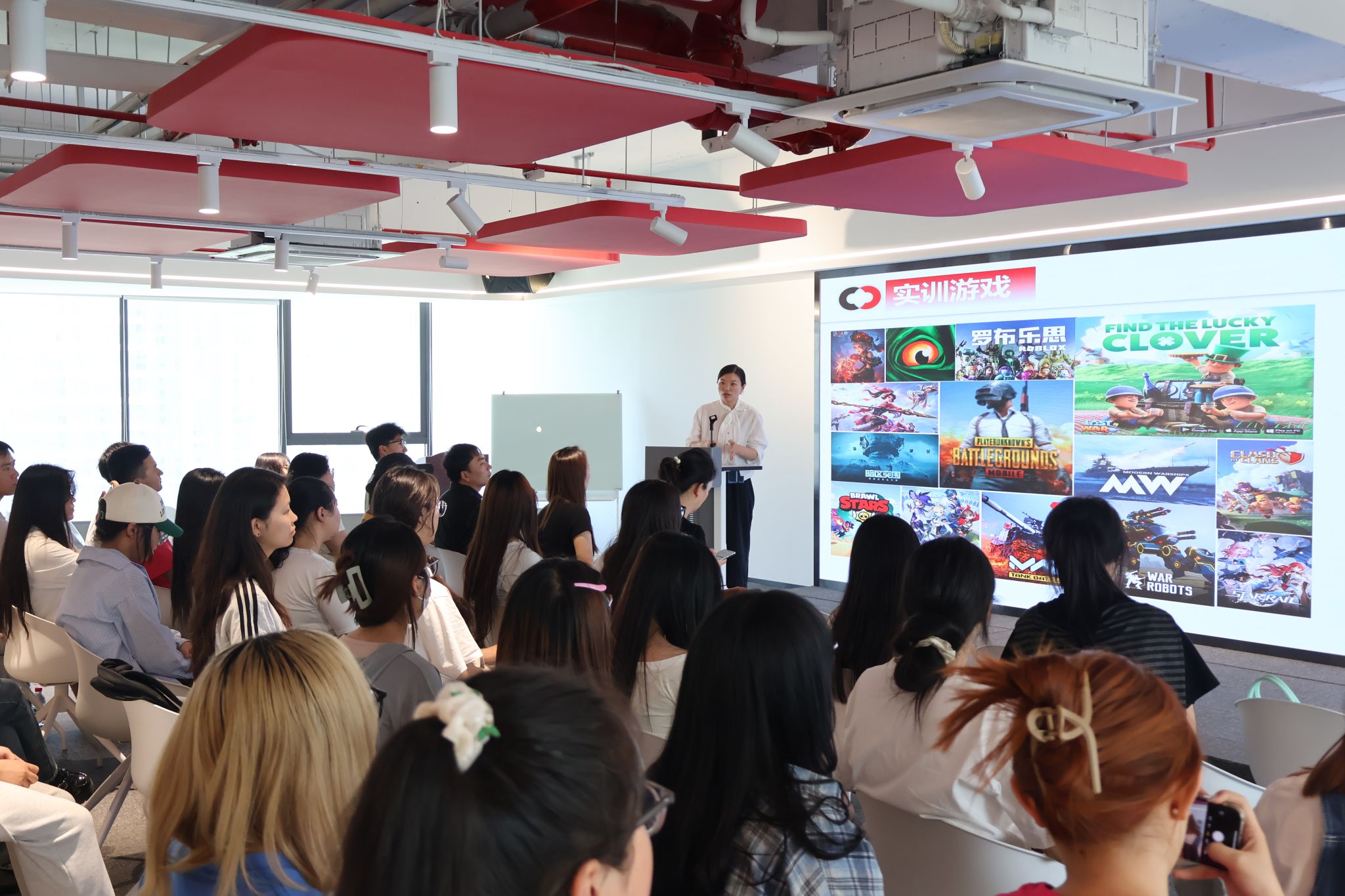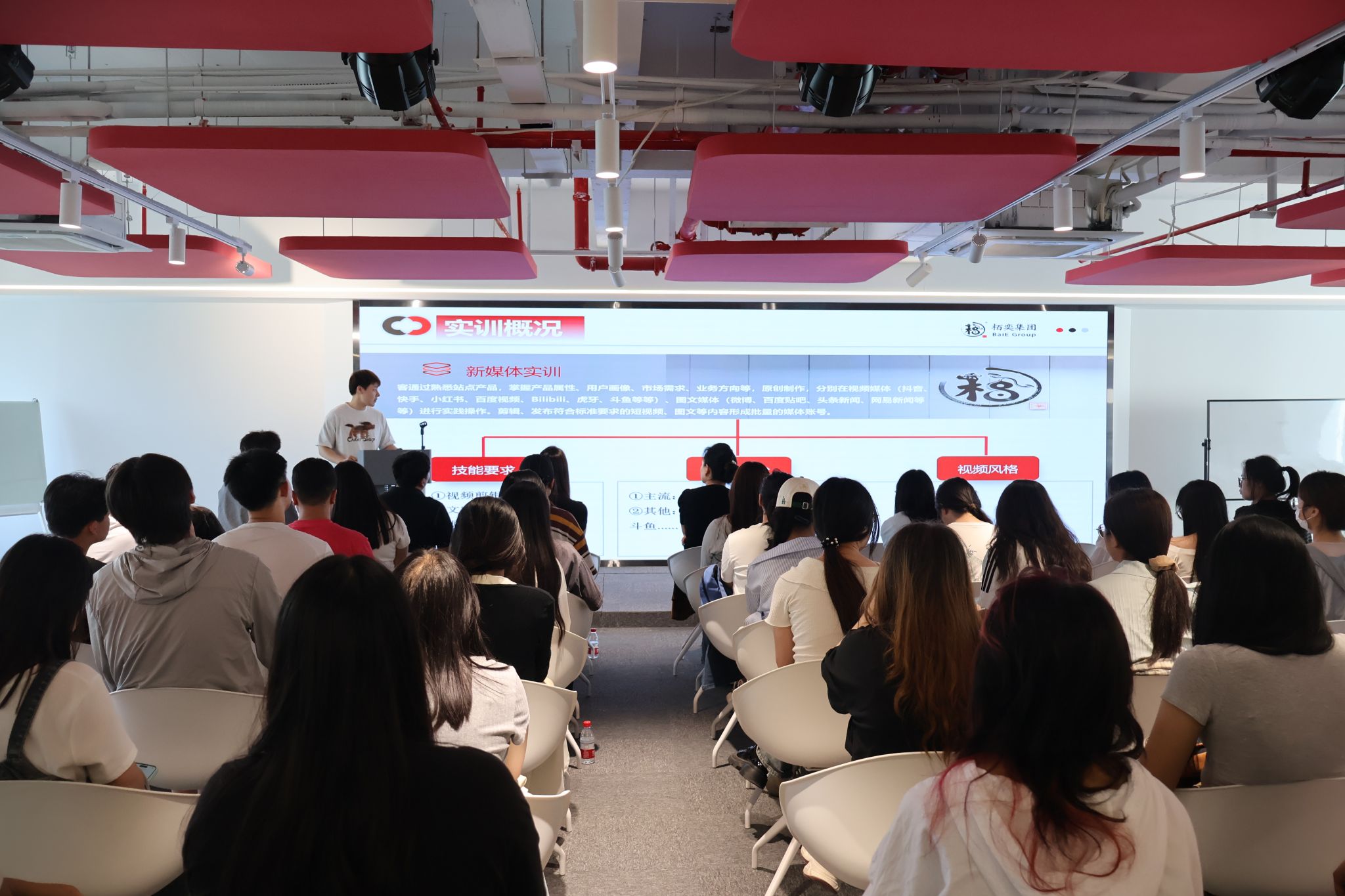随后,“刺氪”项目负责人王君详细讲解了短视频行业的商业逻辑,涵盖趋势分析、内容制作、软件运营及数据分析等环节。技术指导崔瀚文则结合案例,拆解了游戏类短视频的制作类型与全流程。人力资源总监王汐妍介绍了“产教融合新媒体实训营”的培训方式、地点、要求、职业发展路径、实训就业等具体情况。同学们围绕“零经验如何入行”“行业发展趋势”等话题踊跃提问,并表示对实训营非常感兴趣,主动加群报名。
