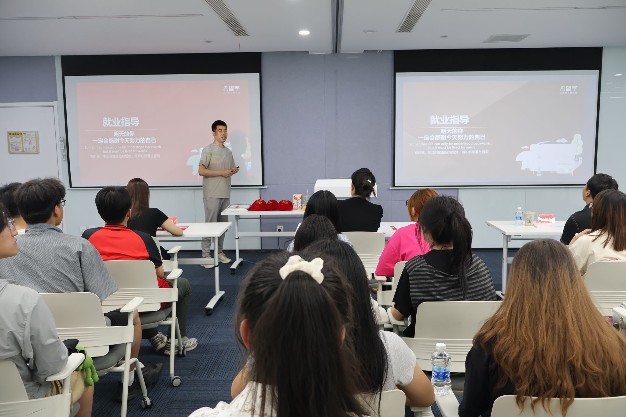 希望学人力资源负责人王钰佳向学院师生介绍了机构背景与发展历程,通过云游博物馆、吉木乃县教育公益等项目案例,展示了企业教育理念与社会责任;并详细说明了希望学“主讲教师+班主任”双师模式的岗位职责、福利待遇及兼职实习岗位的招聘要求。