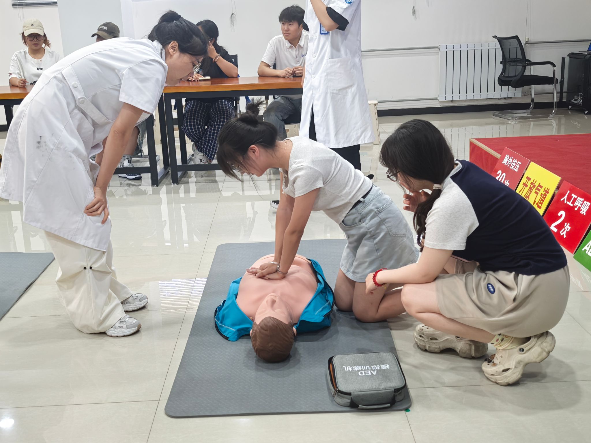 培训最后,参训学生分组进行心肺复苏按压、AED操作模拟、外伤包扎等核心技能的实践练习。医护人员全程巡视指导,提供一对一纠错答疑,确保每一位学生切实掌握关键应急救护技能。