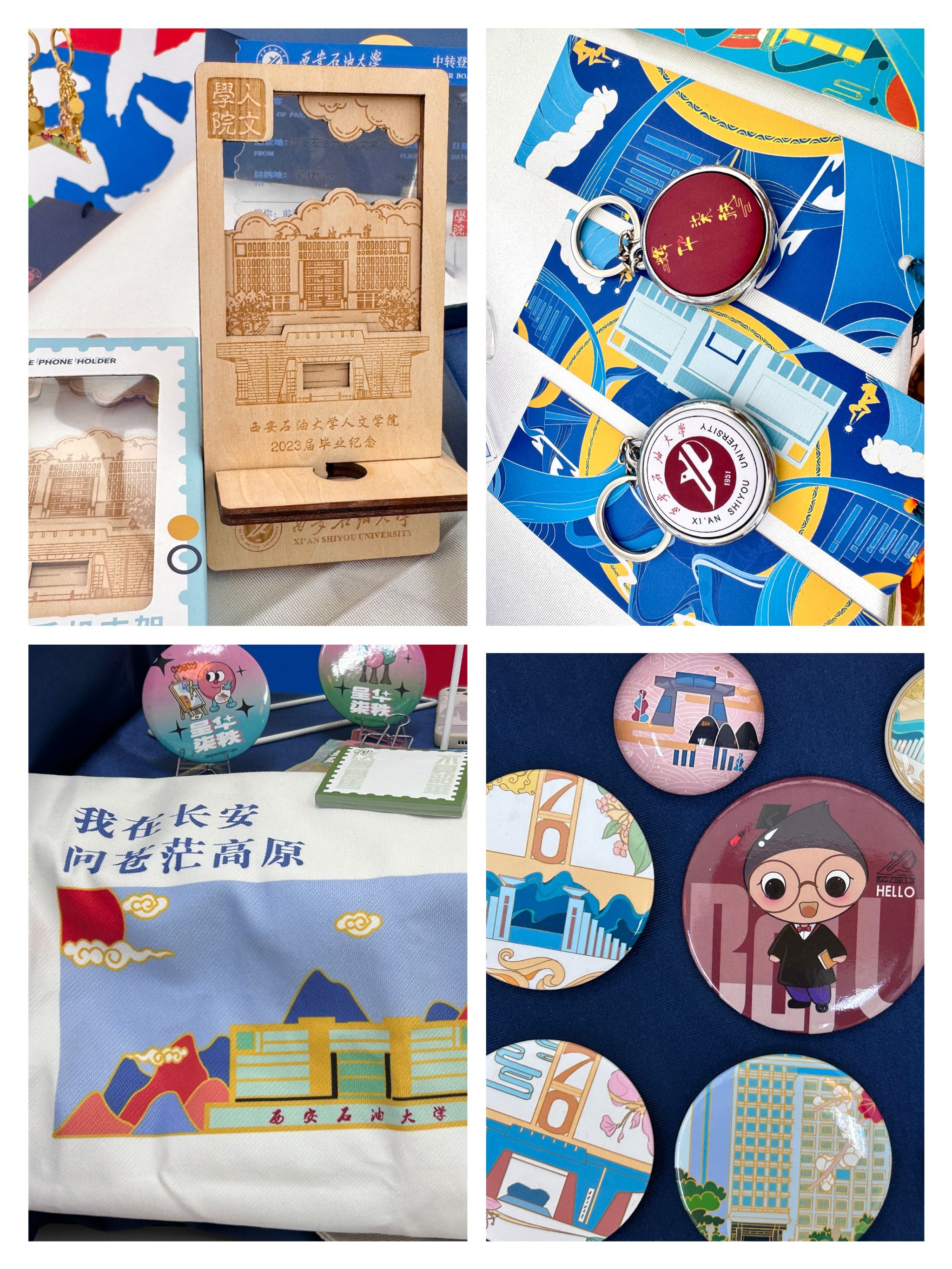学生精心设计的各类主题文创作品,涵盖学习用品、生活好物、艺术装饰等多个品类。展台上,印有校训、校园风景的定制笔记本、书签、明信片等文具类产品兼具实用性与纪念意义;以学校标志性建筑为灵感的徽章、钥匙扣、帆布包等文创周边,展现了学子对校园的深厚情感;还有学生手绘的原创IP形象衍生品等艺术创作,将西石大的文化底蕴与青春创意完美融合。值得一提的是,许多作品融入了“铁人精神”“石油特色”等学校特有元素,体现了学生们对学校历史与精神的深刻理解,也传递出新时代青年传承校风、为校争光的决心。