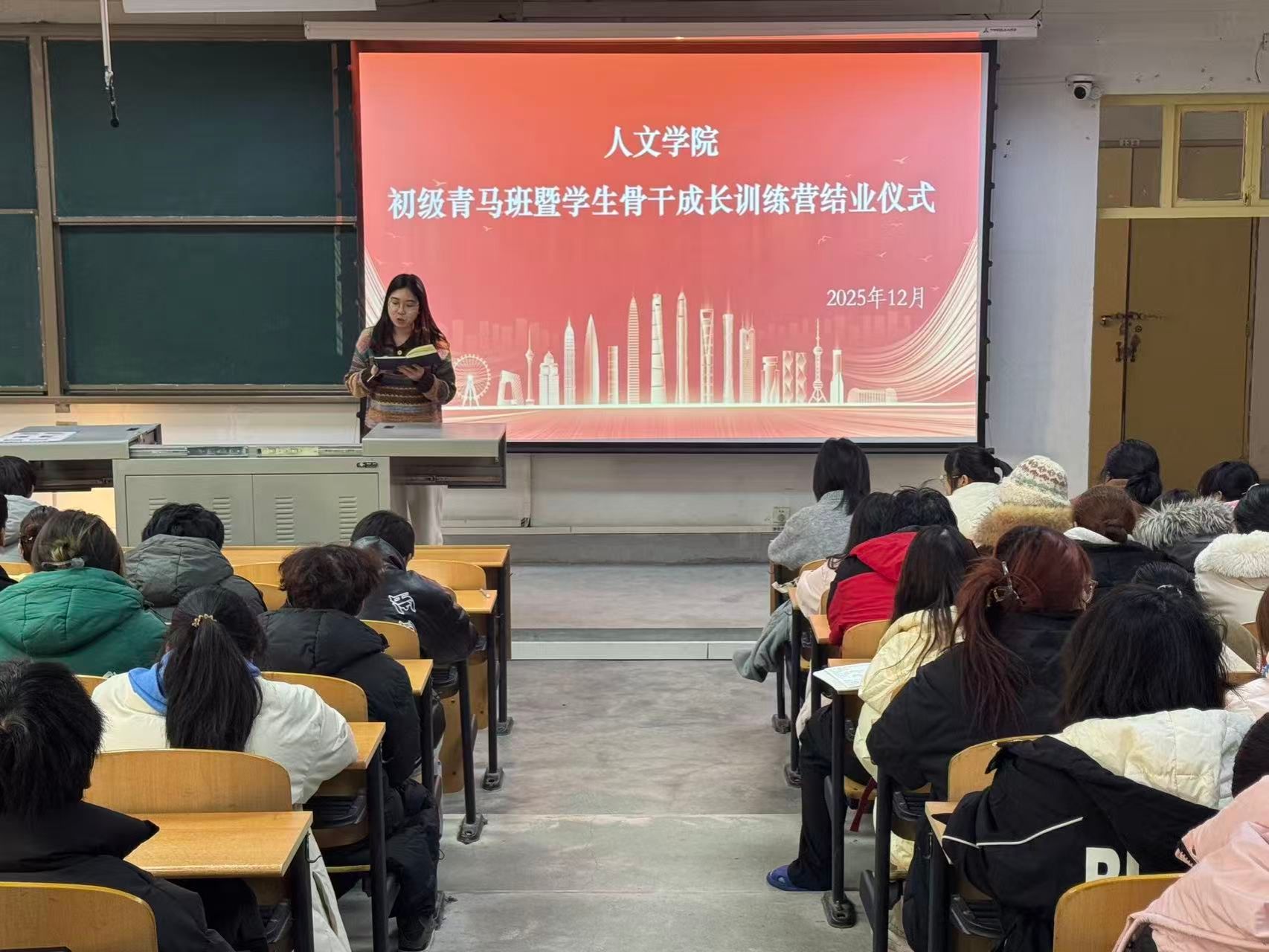 在鄠邑校区A139教室举行初级青马班暨学生骨干成长训练营结业仪式与2025级年级大会。2025级全体学生共同参与本次活动。